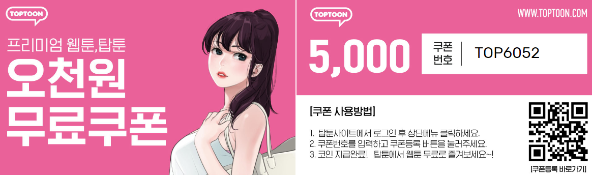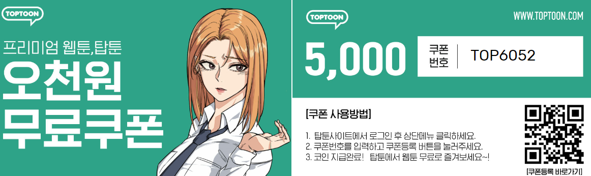 탑툰 무료쿠폰 번호는 TOP6052 입니다. 사용